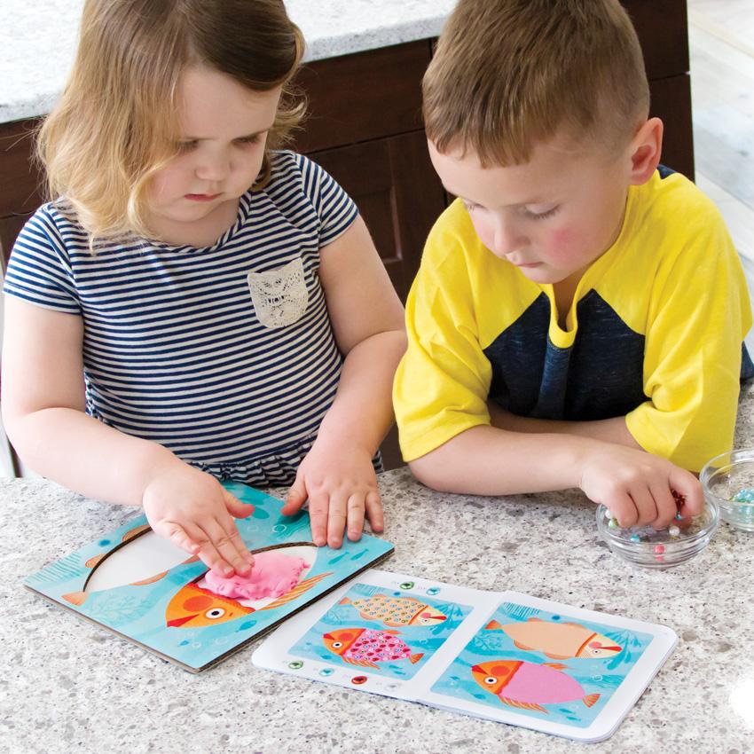 Your preschooler will experiment with shapes, textures, and colors as he creates sweet pictures of a playful kitty, an ornate hen, and a small school of fish. What a fun way to develop the fine motor skills of preschoolers!