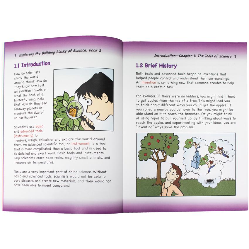 Exploring the Building Blocks of Science Book 2 Student Textbook has 22 chapters and introduces students to the basic tools used in chemistry, biology, physics, astronomy, and geology. Students learn about the microscope, how hammers and lenses are used to study rocks and minerals, and how telescopes and spacecraft help astronomers study the universe. Students also explore acids and bases, chemical reactions, protists, fungi, forces, mass, inertia, linear and curved motion, the geosphere and atmosphere, constellations, the solar system, stars, and much more.