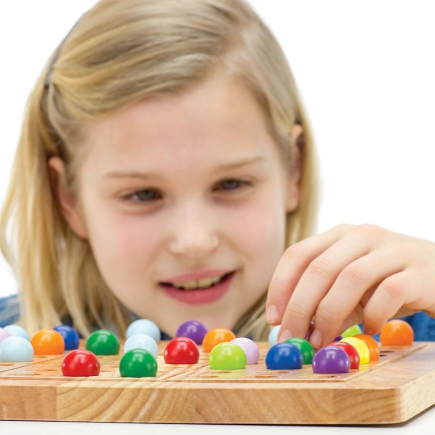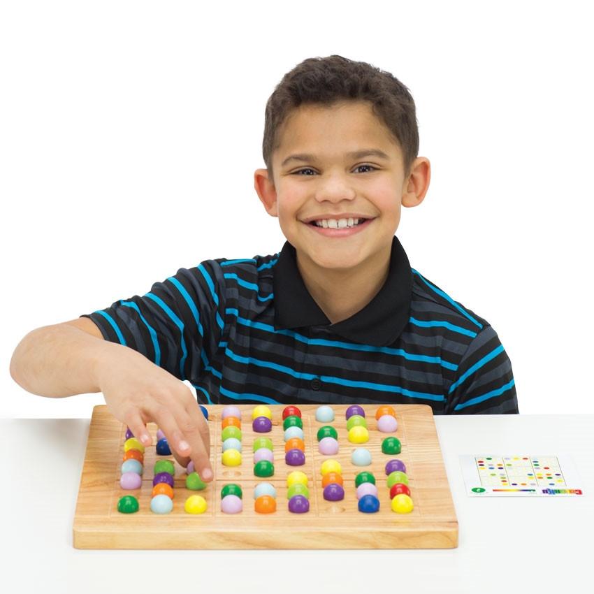 Over 100 puzzle cards are included, with difficulty ratings from easy to challenging. Thankfully, the answer to each puzzle is also provided. And because you can readily convert any Sudoku puzzle into a ColorKu puzzle with the addition of the color conversion card, your child will never run out of challenges. ColorKu is such a visually-beautiful game you may find yourself leaving the game out for an impromptu game. We have found that it is perfect as an impromptu diversion for restless visitors whose parents are preoccupied. We fill the board; then, depending on the child's cognitive ability to handle challenges, remove an appropriate number of wooden marbles and let him figure out where the missing pieces belong.