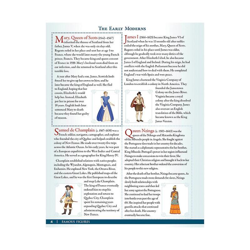 If your student is an avid artist, he will be pleased to discover that a colorable version of each figure is included on the same sturdy cardstock. While you read historical accounts aloud, he can color in the detailed figures of people who shaped history, like Julius Caesar, Harriet Tubman, William Shakespeare, and others. The meticulous child who wants to color it exactly right will be pleased that matching pre-colored figures are also included.