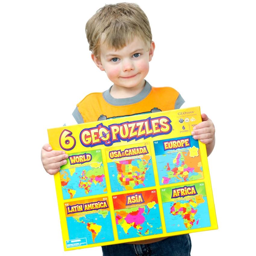 The Global Puzzle we carry is an incredible teaching tool. But why wait until your child is 10 years old to teach him geography, when children as young as four can learn with amazing accuracy the countries of Europe, Africa, Latin America, and Asia and the states of the USA, with Geopuzzles?