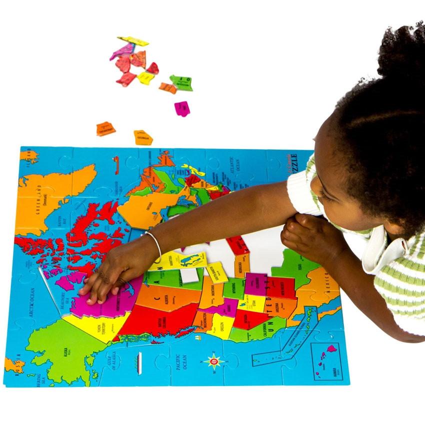 Just like The Global Puzzle, pieces of Geopuzzles are shaped like individual countries or states, so children learn as they put the puzzle together. Geopuzzles are made from durable cardboard. Jumbo-sized and brightly-colored Geopuzzle pieces are easy for chubby hands to manipulate. Winner of a Dr. Toy Smart Play/Smart Toys Award, these puzzles are perfect for ages four to 12.