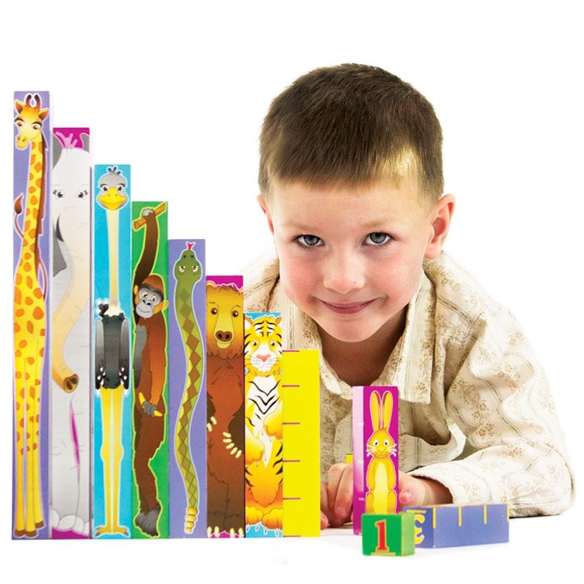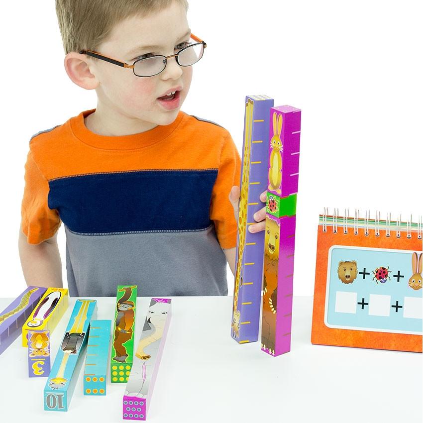Next, use the Inchimals to build a tower or form a train while you familiarize your child with addition and subtraction. He will quickly grasp that one frog (length) plus one monkey (length) equals one elephant (length). Or one ostrich (length) minus one mouse (length) equals one bear (length). See how easy it is?