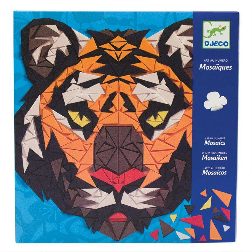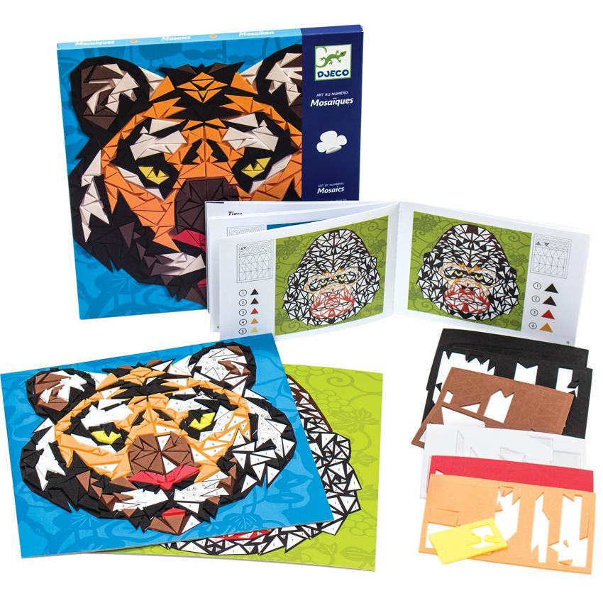 Djeco's beautiful art-by-numbers kit, Khan Mosaics, creates two impressively-illustrated pictures any preteen would enjoy. By just following the numbers and adding the correctly colored foam sticker tile to the backgrounds he will assemble two imposing pictures; a grumpy gorilla and a thoughtful tiger.