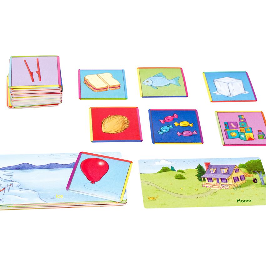 To begin, select a large path card depicting an obstruction. Then, each player considers how one of the randomly drawn tool cards he has could help him navigate the obstacle and safely arrive home. Will he use a pogo stick to jump over the lion, a rope to scale a wall, or bubbles to distract a troll?