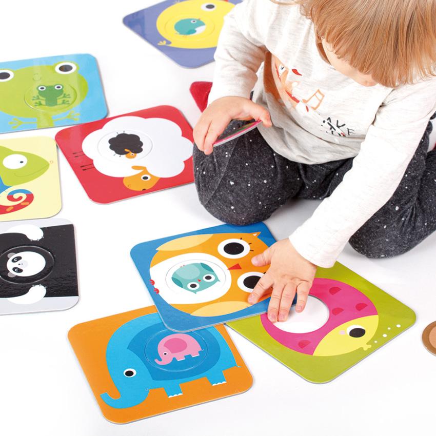 Match the Baby puzzles is both a sorting toy and a toddler puzzle. Made of super sturdy (think board-book-sturdy) cardboard, Match the Baby puzzles encourage eye-hand coordination, concentration, and logical thinking with the delightful theme of mothers and babies. Toddlers will be asked to locate then place the correct baby with the matching mother. Because the baby shapes are circular, success is nearly guaranteed. Of course, your toddler can also create one-of-a-kind parent-baby pairs for laughs or, if your circumstances dictate, to begin a discussion on fostering and adoption.