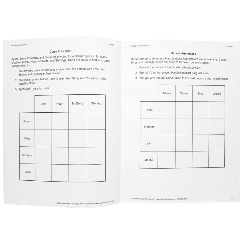 Prepares your child for testing! Develops reading comprehension, logic, and problem solving. New version offers twice as many activities! Mind Benders Book 4 is composed of activities from the old Mind Benders A3 and A4 books.