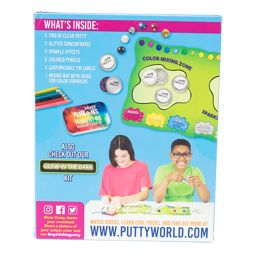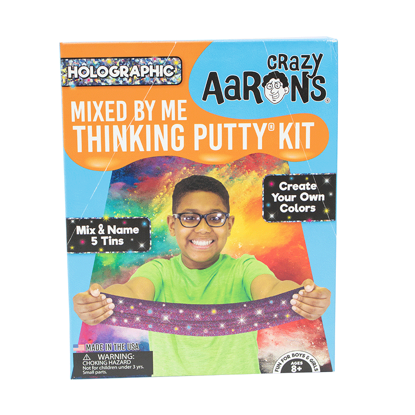 The Holographic Mixed by Me Kit enables your child to create their own shimmering, shining, sparkling Thinking Putty. Holographic Mixed by Me includes three special effect concentrates: Opal-izer for a luscious shimmering effect, Mystify-er for a rich, dimensional effect, and the inimitable Holo-izer for an inexplicable depth of sparkle. Every Holographic Mixed by Me kit includes five tins of clear putty, three glittering color concentrates, three sparkle effect concentrates, and an instructional mat.