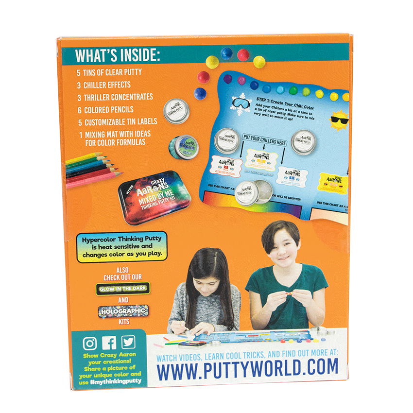 With Hypercolor Mixed by Me, your child will create their very own color-changing Thinking Putty that transforms with the heat of their hands. Each Hypercolor Mixed by Me kit includes five tins of clear putty, three Chiller Concentrates (to create your putty’s natural hue), three Thriller Concentrates (to create the warmer-temperature color), and an instructional mat. Plus, Crazy Aaron has created a series of instructional videos to train your children in advanced to expert hypercolor formulas. Design, mix, and enjoy your marvelous color-changing Thinking Putty!