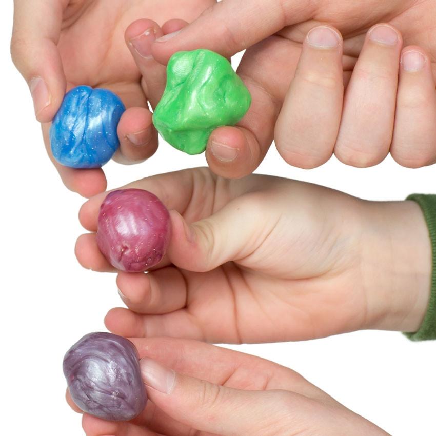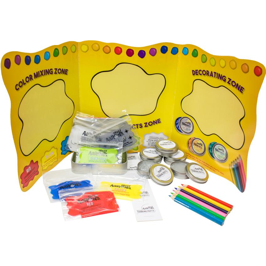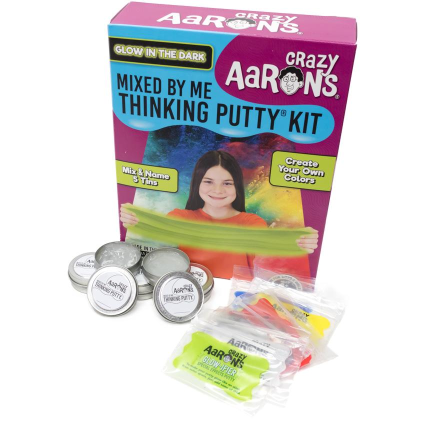 Now your child gets to enjoy the same design experience with Mixed by Me, Thinking Putty’s first creative kit. Start with an idea: “I want a putty that reminds me of scuba diving with Uncle Tim.” Then, using the instructional mat; one of the five small tins of clear putty; and the yellow, red, and blue concentrated putties; he will mix and match until he arrives at that just-right blue-green color. Enhance it with a smidgen of Glow-ifier and enjoy its awesome green glow by night. Or maybe your child wants to capture the color of that crazy metallic car he saw while shopping. Start with another tin of clear putty, recreate the color, add a bit of the Shimmer-izer and a touch of the Sparkle-izer and voila, instant success. And like all Thinking Putty, every special color created will never dry out. With five tins of clear putty, three concentrated color putties, three special effect putties, an instructional mat, and labels to customize, all he needs is a colorful imagination and some cool names!